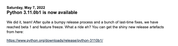 5月7日,Python团队发布最新的 Python 版本 - Python 3.11。目前发布的是一个测试版本 (Beta1) ,供开发者们测试或实验时使用。