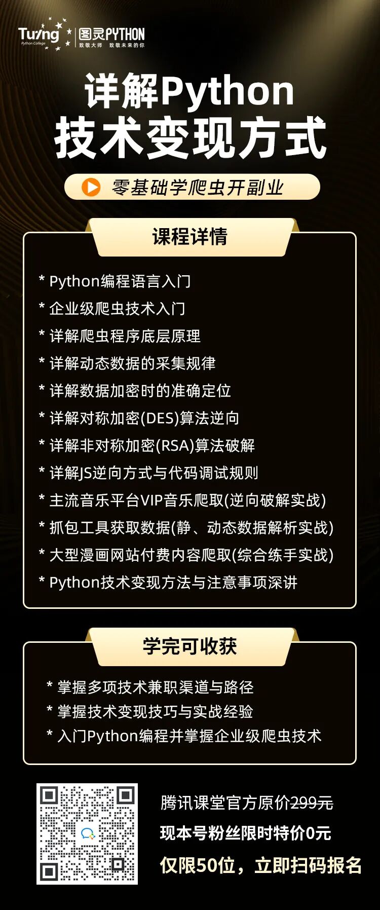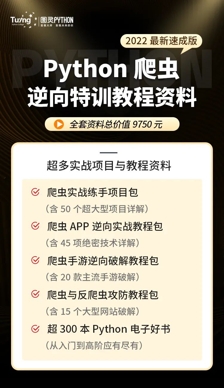此外,本次课程不仅限于技术干货传授,更有技术大佬十余年积累的技术面试+兼职接单的经验分享。报名参加并完成特训的朋友还可以免费获得一整套大厂内部的Python爬虫逆向教程包!学完速成干货课程,要第一时间拿大厂高阶项目实战巩固,进一步提升技术,这套资料就非常适合练手!