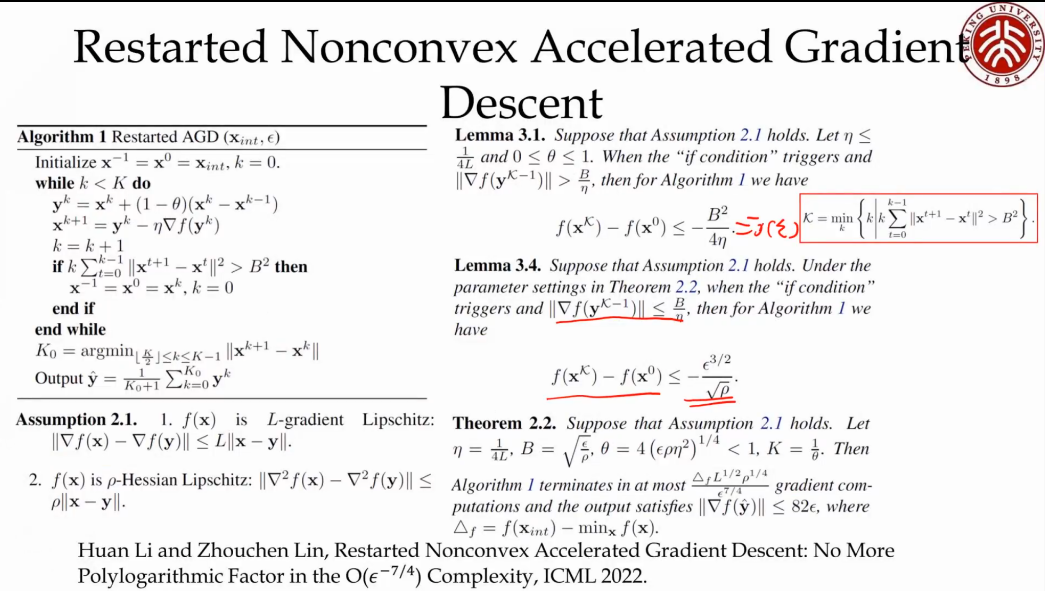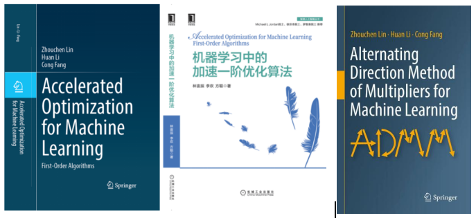 最后林宙辰教授又讲授了他的最新工作——基于重启的非凸优化一阶加速算法,该工作发表在今年ICML会议上,形式非常简单且把现有最优复杂度中的给取消了,首次达到了。林宙辰教授讲解了该算法的主要步骤和设计思想,构思巧妙,颇具启发性。 演讲结束后,参加线上讲座的同学和老师踊跃提问,林宙辰教授耐心回答了的每个问题。整个讲座生动有趣,内容丰富,原定一个小时的讲座时间又延长到近一个半小时。图为林宙辰教授专著《机器学习中的加速一阶优化算法》的英文版和中文版,以及刚出版的新书《Alternating Direction Method of Multipliers for Machine Learning》。本系列讲座线上直播信息为: