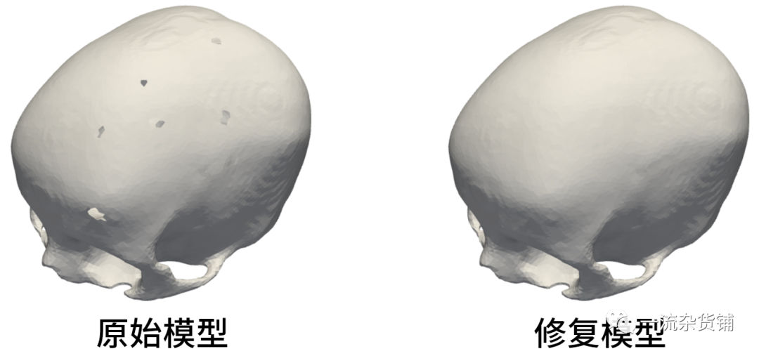 参考Magics软件修复功能中的定义,三维模型常见的几何错误类型包括坏边、缝隙、孔洞、干扰壳体、重叠三角面片以及相交三角面片等。这边重点介绍Pymeshfix库,细心的小朋友可能会注意到,之前的几个章节一直没提到这个库。因为,看名字就知道了,这个库是专门为mesh修复而生的,并且这个库是依赖Pyvista的,所以在安装Pymeshfix之前需要先安装Pyvista。虽然Pymeshfix对上述几种几何错误都有针对性的修复算法,但大多数时候我们只需要用他的综合修复函数repair或者clean_from_arrays/clean_from_file就够了,可以自动修复上述错误类型。仍然以之前的颅面模型为例,手动构造一些简单的孔洞缺陷,使用repair函数修复,代码如下: