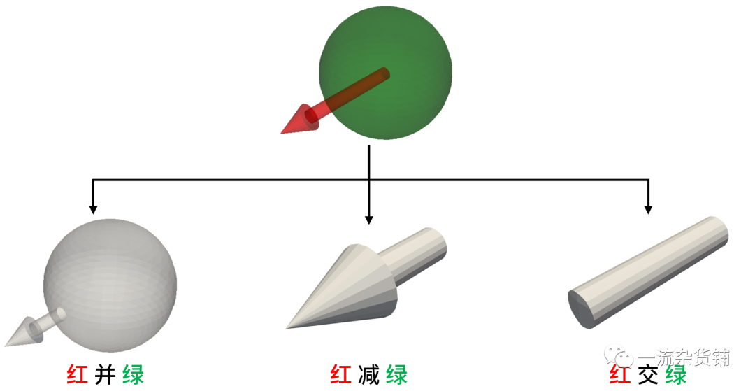 布尔运算包括交、并和减,常用于两个模型的组合建模,此处以Pyvista为例说明布尔运算使用方法。trimesh也可以做布尔运算,但它需要额外安装blender或scad作为布尔运算的计算后端,比较麻烦,不是很建议使用这个。假设有一个红色箭头和一个绿色球体,布尔并、减、交的Pyvista实现如下:import pyvista as pv