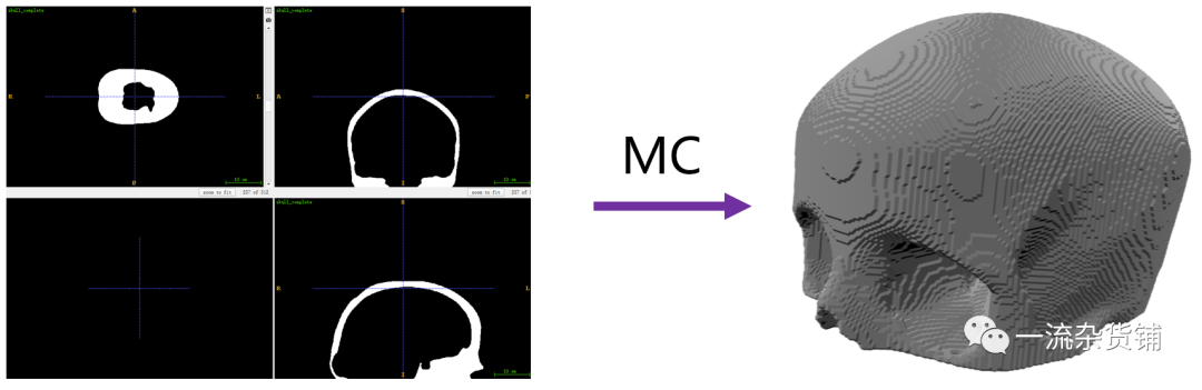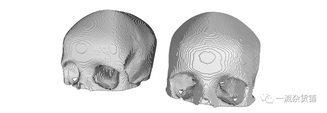 其中nibabel为用于处理CT影像数据的Python函数包,另外使用了Pytorch的interpolate对原始数据进行压缩(用Pytorch较为繁琐,也可以直接numpy切片),否则MC算法耗时会过长。Line11使用了pad是因为这组数据刚好位于图像边缘,重建出来会不封闭,所以给边缘也填充一些数值。Line12使用了skimage提供的MC函数,网上查到的MC算法python实现基本都是调用skimage,所以我当时也是用的是skimage,实际上Pyvista也可以,之后的文章中会提到。重建结果如下,左侧为CT数据(可使用ITK-SNAP软件查看),右侧为重建的mesh模型。可以看到模型并不是十分光滑,后期可以使用光顺算法对其进行后处理。