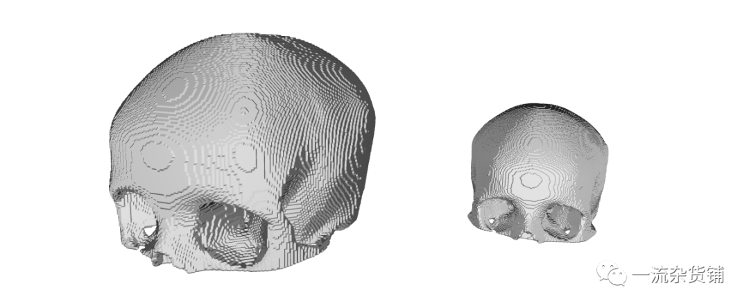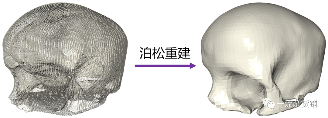 除MC算法以外,泊松重建也是使用非常广泛也非常经典的三维重建算法(参考文献-Poisson Surface Reconstruction),但常用于由点云重建mesh或由破损/不完整模型重建封闭(watertight)模型。把刚刚重建的颅面模型拿来继续用,读取其中的点云,然后使用泊松重建得到mesh模型。代码如下: