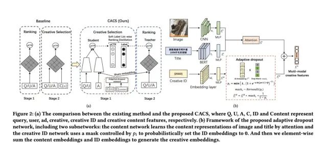 相较于现有的大多数框架,CACS将创意选择前置到精排之前,首先进行广告内部的创意选择,再进行广告间的CTR排序。在创意选择过程中,首先,引入双塔结构,有效控制创意阶段的耗时,其次,引入蒸馏学习,来重点学习创意的优先顺序而非准确的CTR预估值,同时也可以在一定程度上减小模型的大小,减少耗时,最后,通过自适应的dropout网络,来学习创意的多模态信息表示,通过多模态的side-information来减少创意没有足够曝光所带来的影响。接下来,对这两部分的具体结构进行介绍。