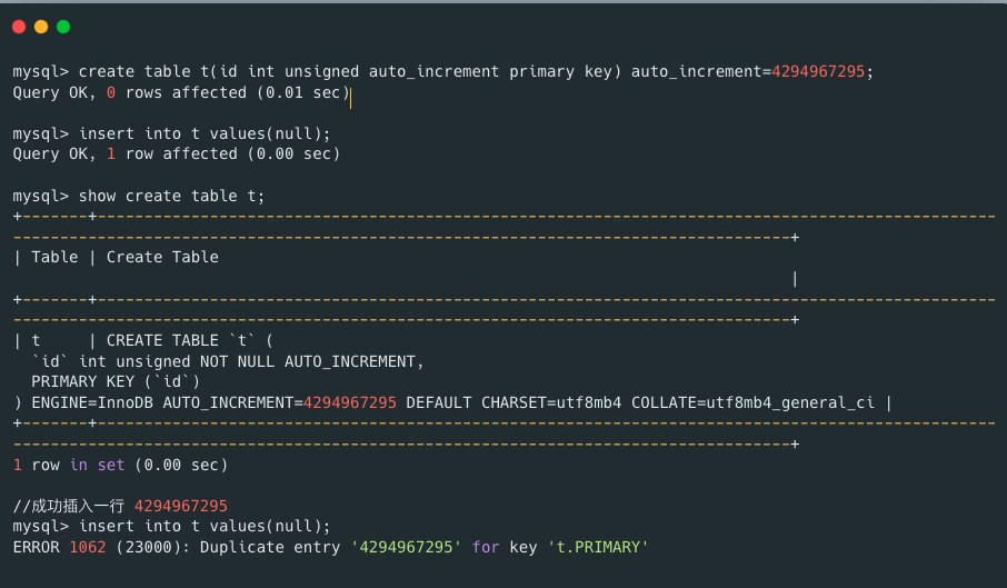 第一个insert成功后,该表的AUTO_INCREMENT还是4294967295,导致第二个insert又拿到相同自增id值,再试图执行插入语句,主键冲突。