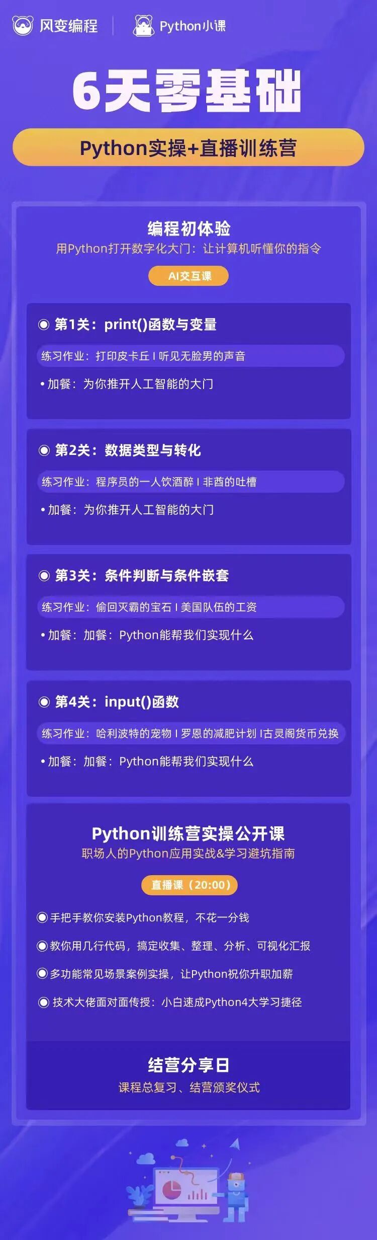 ”1> 直播步骤式实操了大量真实的场景案例,每次操作都会详细讲解步骤,跟着做你也可以用Python做出爬取、统计等作品。2> 注重学员体验,不用打卡集赞,没有捆绑广告,助教也非常nice,我一有问题就会及时解答。这次给大家争取到了《零基础python直播公开课》的福利: 6天python入门体验课+《零基础python直播公开课》