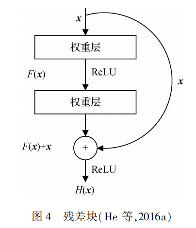 ResNet由堆叠的残差块组成,残差块结构如图所示,残差块除了包含权重层,还通过越层连接将输入x直接连到输出上。