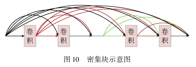 DenseNet由密集块组成,密集块结构如图所示,密集块采用前馈的方式将所有层。DenseNet每一层都从其前部所有层获得输入并将自己的输出特征图传递到后部层,这种方式增强了特征重用。