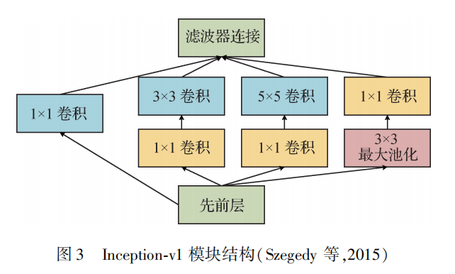GoogLeNet采用了Inception-v1模块,该模块采用稀疏连接降低模型参数量的同时,保证了计算资源的使用效率,在深度达到22层的情况下提升了网络的性能。Inception-v1包含4条并行的支路,3×3卷积、5×5卷积之前的1×1卷积和3×3最大池化之后的1×1卷积用来减少参数量。