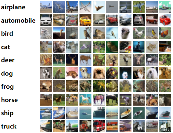 CIFAR-10数据集有60000幅彩色图像,分辨率大小为32×32像素,共10个类别,每个类别包含6000幅图像。训练集包含50000幅彩色图像,测试集包含10000幅彩色图像。测试集的图像取自10个类别,每个类别分别取1000幅,剩余的图像构成训练集。