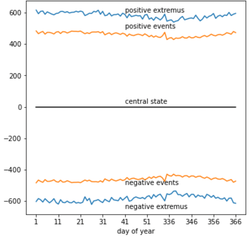 Positive (negative) events are identified as those days at which the values are above (below) the thresholds. If the values of several consecutive days are above their corresponding shresholds, they are regarded as one single event, but with a duration of several days. Such thresholds can be quantile 90 (10) for extreme positive (negative) events, or mean plus (minus) one standard deviation for positive (negative) events. The quantile, mean and standard deviation should be calculated on each day of the year (so called climatological daily quantile, mean or std. can be easily implemented with cdo command: cdo -ydaypctl, -ydaymean, -ydaystd, python details see below). Thus, we would have 365 different thresholds. See Fig.1 for details.