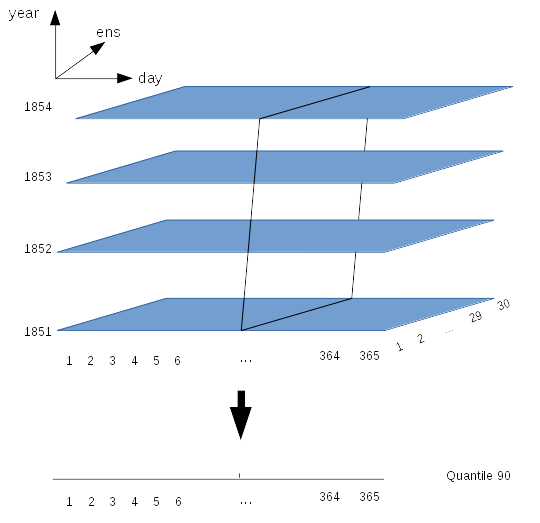 Fig1.How to get threshold for an event. Here shows the procedure to get the threshold for each day of year with grand-ensemble (simulation data) data. For each day, the threshold is got from a data with size of (black bold line outlined data). For the observational data, because there is only one realisation, for each day, one can get the threshold from data of 7 days (window) ahead and after that day, and all the years, i.e., get the quantile or standard deviation from a data with size of . This can be easily implemented by DataArray.rolling function in python.