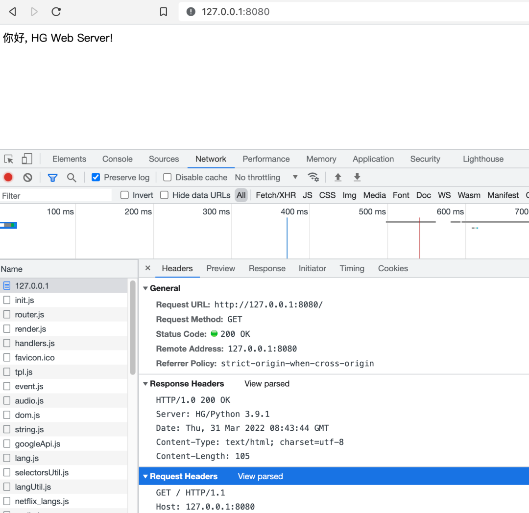 )) # 写入响应 body,即:页面内容 def send_response (self, code, message=None) : # 响应体格式 """ {HTTP version} {status code} {status phrase}\r\n {header field name}:{field value}\r\n ... \r\n {response body} """ # 写响应头行 self.wfile.write("%s %d %s\r\n" % ("HTTP/1.1" , code, message)) # 加入响应 header self.send_header('Server' , "HG/Python " ) self.send_header('Date' , self.date_time_string())以上就是 handle 处理请求和返回响应的核心代码片段了,至此 HTTPRequestHandler 全部内容均已讲解完毕,下面将演示运行效果。