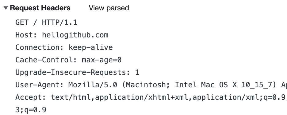 在解析 HTTP 之前,需要先看一个实际的 HTTP 请求,当我打开 hellogithub.com 网站首页的时候,浏览器发送的 HTTP 请求如下: