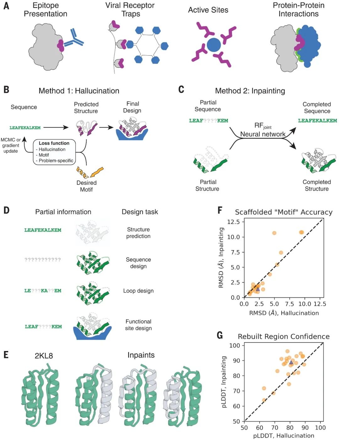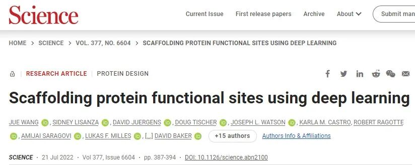Wang J, Lisanza S, Juergens D, Tischer D, Watson JL, Castro KM, Ragotte R, Saragovi A, Milles LF, Baek M, Anishchenko I, Yang W, Hicks DR, Expòsit M, Schlichthaerle T, Chun JH, Dauparas J, Bennett N, Wicky BIM, Muenks A, DiMaio F, Correia B, Ovchinnikov S, Baker D. Scaffolding protein functional sites using deep learning. Science. 2022 Jul 22;377(6604):387-394. doi: 10.1126/science.abn2100.