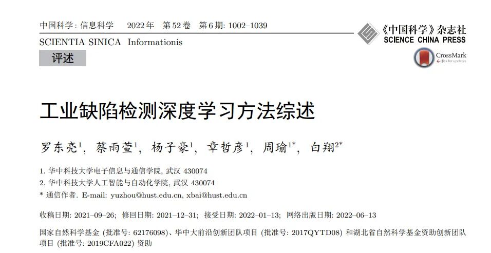 基于深度学习的工业缺陷检测方法可以降低传统人工质检的成本, 提升检测的准确性与效率, 因而在智能制造中扮演重要角色, 并逐渐成为计算机视觉领域新兴的研究热点之一. 其被广泛地应用于无人质检、智能巡检、质量控制等各种生产与运维场景中. 本综述旨在对工业缺陷检测的任务定义、难点、挑战、主流方法、公共数据集及评价指标等进行全面归纳, 以帮助研究人员快速了解该领域. 具体而言, 本文首先介绍工业缺陷检测的背景与特点. 接着, 按照实际数据标注情况, 划分出缺陷模式已知、缺陷模式未知与少量缺陷标注 3 种研究任务设置, 并根据方法类型作进一步归纳与分析, 探讨了各方法的性能优劣与适用场景, 阐明了方法与实际应用需求的关联性. 此外, 本文还归纳了方法部署中的关键辅助技术, 总结了现有方法在实际产业落地中存在的局限性. 最后, 本文对该领域未来的发展趋势和潜在研究方向进行了展望.原文链接:http://scis.scichina.com/ssi2022.html#526