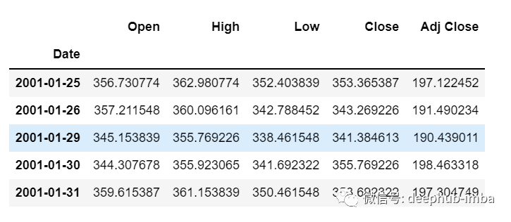 现在让我们花点时间看看数据:csv文件中包含了谷歌从2001-01-25到2021-09-29的股票数据,数据是按照天数频率的。