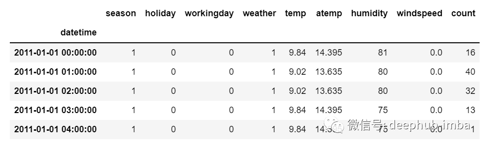 但是在多元时间序列数据的情况下,将有不同类型的特征值并且目标数据将依赖于这些特征。正如在图片中看到的,在多元变量中将有多个列来对目标值进行预测。(上图中“count”为目标值)