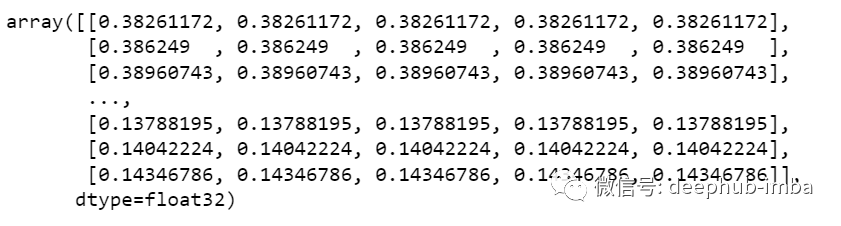 4132 是 trainX 中可用的数组总数,每个数组共有 30 行和 5 列, 在每个数组的 trainY 中,我们都有下一个目标值来训练模型。让我们看一下包含来自 trainX 的 (30,5) 数据的数组之一 和 trainX 数组的 trainY 值:print("trainX[0]-- \n",trainX[0])