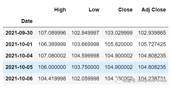 在多元时间序列预测中,需要通过使用不同的特征来预测单列,所以在进行预测时我们需要使用特征值(目标列除外)来进行即将到来的预测。这里我们需要“High”、“Low”、“Close”、“Adj Close”列的即将到来的 30 个值来对“Open”列进行预测。df_30_days_future=pd.read_csv("test.csv",parse_dates=["Date"],index_col=[0])