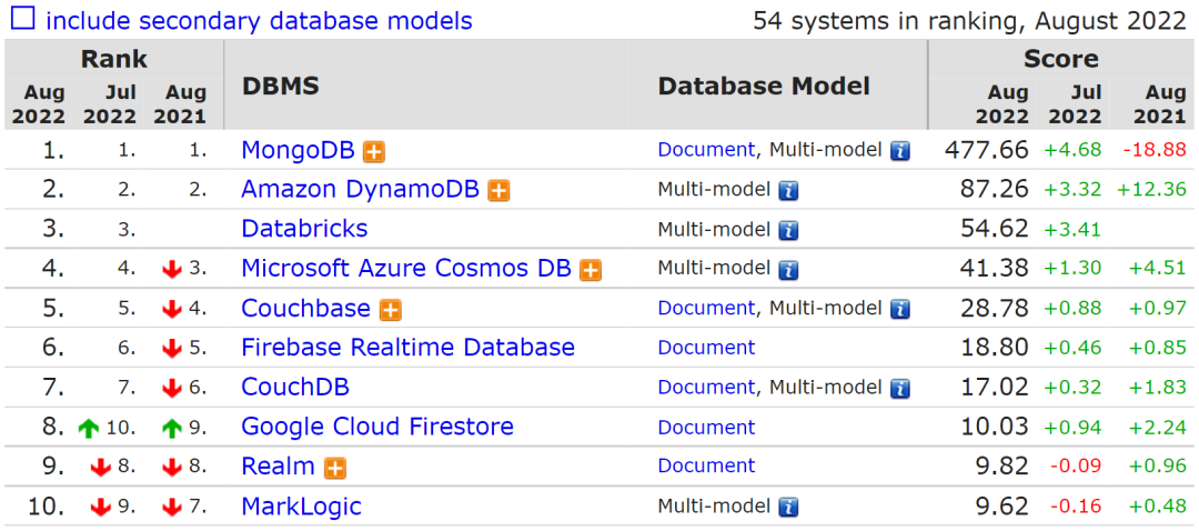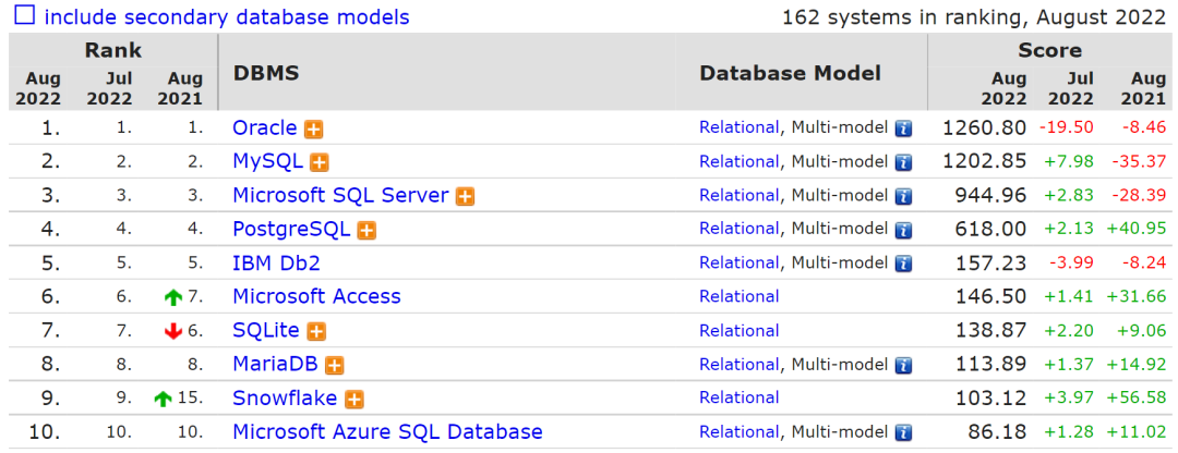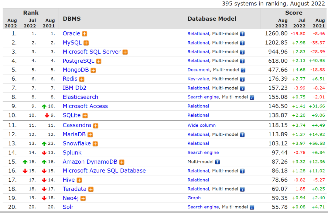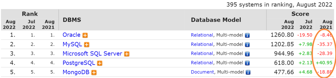 出品 | OSC开源社区(ID:oschina2013)DB-Engines 数据库流行度排行榜发布了 8 月份的更新。可以看到,Oracle 较上月减少了 19.50 分,是本月分数下降最多的数据库,并且连续两个月出现了下滑。分数上涨较多的则是 MySQL 和 MongoDB,两者分别增加了 7.98 和 4.68 分。不过和去年同期相比,三巨头(Oracle、MySQL 和 SQL Server)和 MongoDB 的分数均下降了不少。与之形成对比的 PostgreSQL 则保持着稳定的上升趋势,其每月流行度分数跟去年同期相比都有不少的上涨。下表是 TOP 10 数据库的最新分数和变化情况。| Rank | DBMS | Score | Changes |