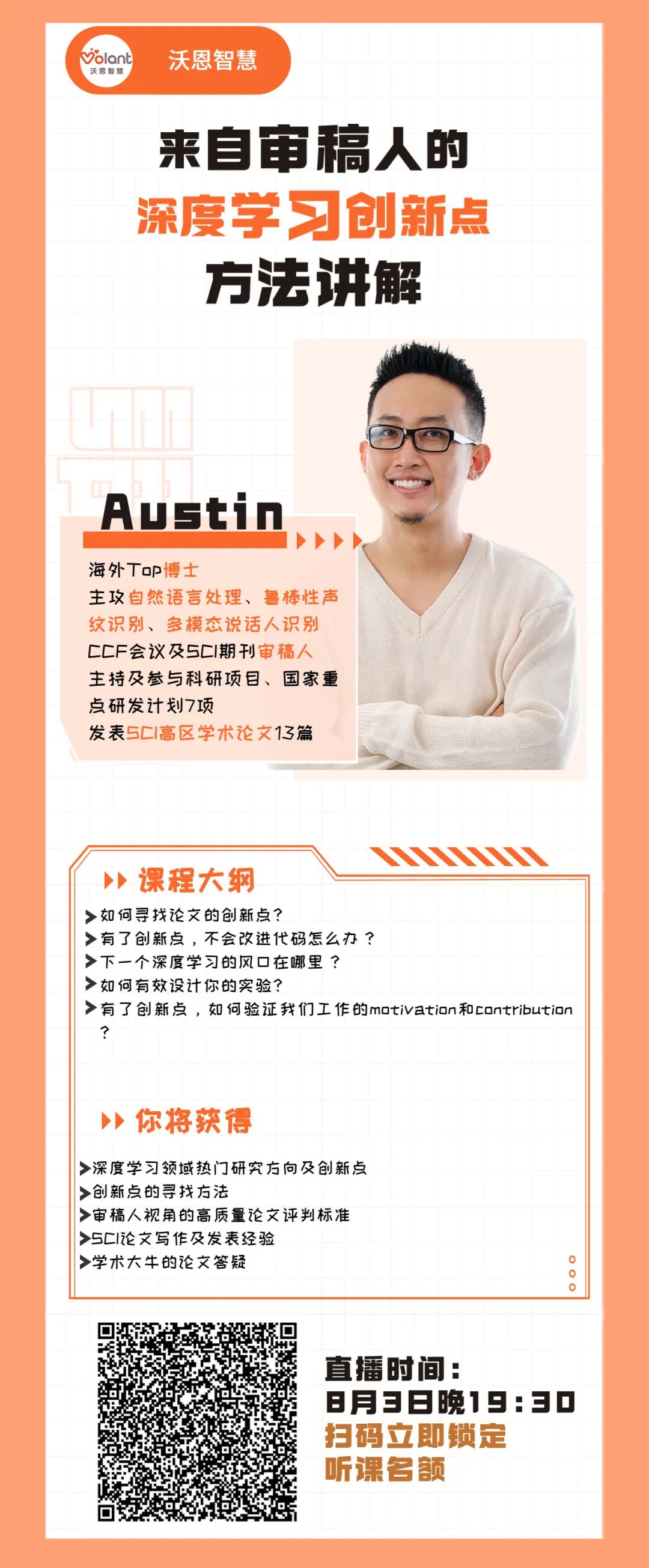 本周,沃恩智慧的论文直播公开课的讲师,将围绕深度学习方向的创新点来展开进行论文写作指导,同时结合导师作为审稿人的经验以及SCI高区论文的写作和发表经验,系统性讲解,如何更好的用论文展现你的idea,讲出一个有说服力的故事。