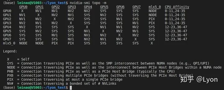 NV表示通过NVIDIA-nvlink互联,速度最快; PHB表示通过PCIe和PCIe主网桥连接(通常PCIe 主网桥是存在于cpu之中,所以PHB可以理解为通过PCIe和cpu相连); NODE表示通过PCIe以及NUMA节点内PCIe主网桥之间的互连(通常NUMA节点内,包含多个cpu节点,每个cpu节点都包含一个PCIe主网桥,所以NODE可以理解为在一个NUMA节点内,通过PCIe和多个CPU相连); SYS表示通过PCIe以及NUMA节点之间的SMP互连(例如,QPI/UPI),这个可以理解为通过PCIe,且跨过多个NUMA节点及其内部的SMP(多个cpu节点)进行互联。 关于NUMA,SMP等服务器结构的简单介绍可参考:服务器体系(SMP, NUMA, MPP)与共享存储器架构(UMA和NUMA)