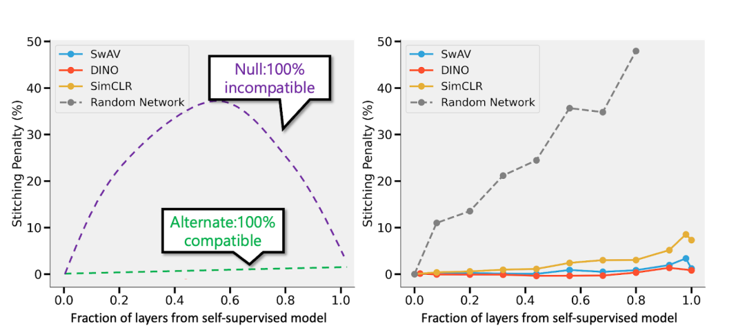 图注:摘自论文“Revisiting Model Stitching to Compare Neural Representations”的自监督与监督模型。左图——如果自监督模型的准确度比监督模型低3%,那么,完全兼容的表示将造成 p·3% 的拼接惩罚(p层来自自监督模型时)。如果模型完全不兼容,那么随着更多模型的缝合,预计准确度会急剧下降。右图——拼接不同自监督模型的实际结果。自监督 + 简单模型的优势在于,它们可以将特征学习或“深度学习魔法”(深度表示函数的结果)与统计模型拟合(由线性或其他“简单”分类器完成,分离出来在此表示之上)。最后,虽然是推测,但“元学习”似乎通常等同于学习表示这一事实(详情看论文“Rapid Learning or Feature Reuse? Towards Understanding the Effectiveness of MAML”),可以视为另一个支持本文观点的证据,不管模型表面上优化的目标是什么。