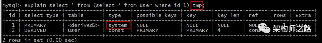 再举一个例子,内层嵌套(const)返回了一个临时表,外层嵌套从临时表查询,其扫描类型也是system,也不需要走磁盘IO,速度超快。