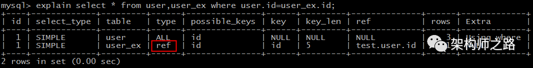 eq_ref扫描的条件为,对于前表的每一行(row),后表只有一行被扫描。