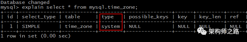 上例中,从系统库mysql的系统表time_zone里查询数据,扫码类型为system,这些数据已经加载到内存里,不需要进行磁盘IO。