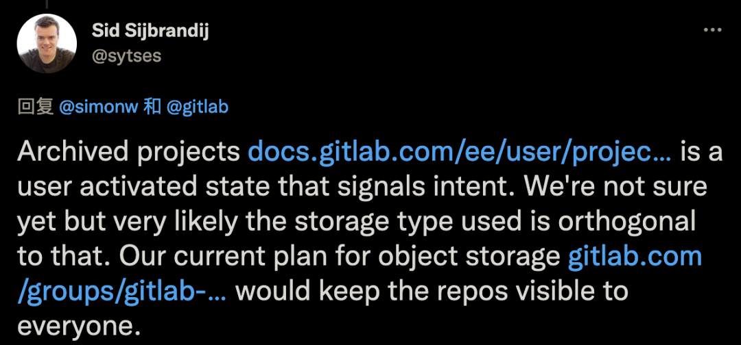 GitLab 的联合创始人兼首席执行官 Sid Sijbrandij 在官方社交账号下也回复道,放入对象存储中的项目仍然对所有公众可见,并不会施加只有所有者可见的限制,而且根据它附加在推文中的链接可以发现,对仓库进行任何读 / 写操作都会自动恢复仓库。