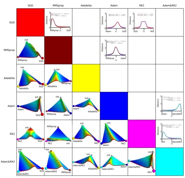 上图是论文的实验结果,横纵坐标表示降维后的特征空间,区域颜色则表示目标函数值的变化,红色是高原,蓝色是洼地。他们做的是配对儿实验,让两个算法从同一个初始化位置开始出发,然后对比优化的结果。可以看到,几乎任何两个算法都走到了不同的洼地,他们中间往往隔了一个很高的高原。这就说明,不同算法在高原的时候,选择了不同的下降方向。