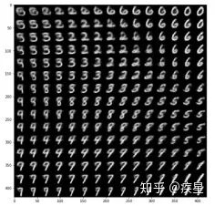 图16 变分自编码器的工作流程(z_mean和z_log_var分别代表潜在图像通过编码器映射后的均值和方差)使用mnist数据集作为变分自编码器训练数据集,生成的图像如图17所示: