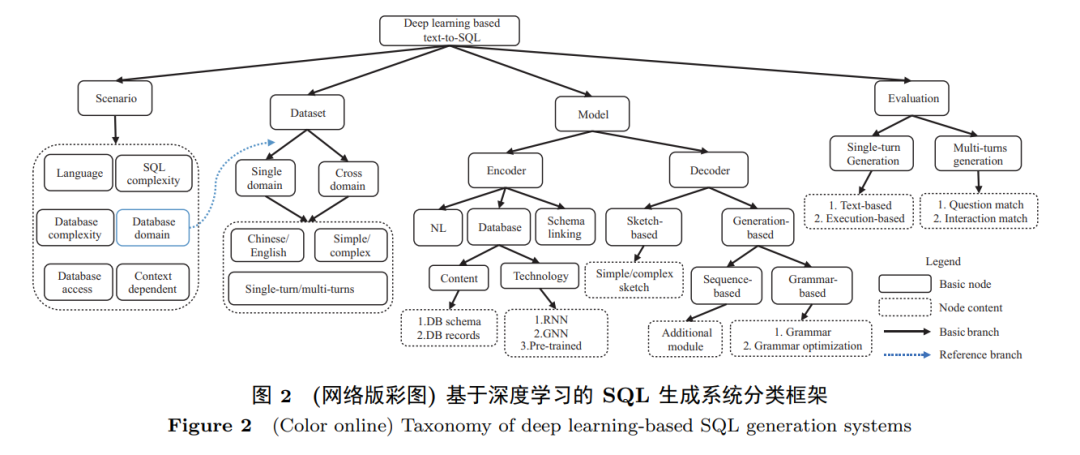 本文对基于深度学习的 SQL 生成研究所涉及的 SQL 生成场景、数据集、模型结构和评估方法进行了详细的划分和总结. 最终得到相应的研究分类框架如图 2 所示. 场景方面, SQL 生成场景反映了生成过程中面临的具体需求和特点, 场景可以根据不同场景元素 加以区分, 如场景中的语种、是否有多轮 SQL 生成等. 一个数据集可以包含实际场景中的多种元素, 根据 SQL 生成不同的需求和特点, 可以选择和组合不同的场景元素, 从而形成符合特定需求的 SQL 生成任务. 之后的数据集研究将根据 SQL 生成场景元素中数据是否包含多个领域的数据库进行划分. 在划分后依然可以从其他场景元素的角度继续分析, 如数据涉及的语种以及是否需要使用多轮 SQL 生成的方式. 数据集方面, SQL 生成数据集可以从是否包含不同领域数据库的角度划分, 分为单领域数据集和 跨域数据集. 在单领域的数据集中, 模型只需要针对单个领域数据库的查询问题生成相应的 SQL 语 句. 单领域的数据集只涉及单一数据库以及单一的领域知识, 因此所需数据数量相对较少, 模型学习 相对简单, 同时应用范围也有限. 在跨域的数据集中, 模型不仅要学习多领域数据库所涉及的知识, 并 要求模型能够泛化到训练过程未见过的数据库. 由于涉及的数据库和领域知识更多, 跨域数据集的数 量也相对较多, 对模型的学习和泛化能力要求更高, 但同时跨域数据集的应用价值相比单领域数据集 更大. 跨域数据集内部也可以根据场景元素的语种、SQL 语句复杂程度以及生成方式是否涉及多轮生 成继续进行划分和组合.