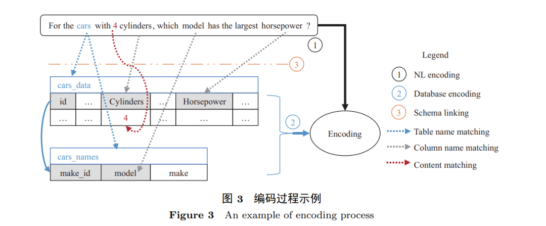 基于深度学习的方法首先要求模型的输入为数字类型的向量, 并要求编码后能够尽可能地保留原 始输入的所有语义. 将输入的信息编码为合适的向量形式是训练深度学习模型中非常重要的环节, 它 将直接决定后续语义解析的效果. 由于 SQL 生成的特殊性, 在编码阶段需要同时考虑自然语言形式的 查询问题、结构化的数据库信息以及自然语言与数据库之间的模式链接信息. 图 3 展示了编码过程中需要考虑的内容. 其中编号 1 为自然语言编码部分, 编号 2 为数据库编码 部分, 编号 3 为模式链接部分. 如图 3 所示, 数据库相关的编码不仅需要考虑数据库模式的编码, 即 针对 cars data 和 cars names 两张数据表的编码, 还需要考虑模式链接的编码, 例如将自然语言中的 cars 对应到图中的两张表, 将 cylinders, model 和 horsepower 对应到表中的列名称. 现有研究工作包 括了在数据库编码部分考虑模式链接的做法, 以及单独考虑提升模型对模式链接理解能力的做法, 下 面将对近年来专注于提升模型模式链接能力的研究工作分开讨论. 除此之外, 数据库内容可以分为数 据库模式和数据库记录, 一些研究工作也对数据库中的记录进行编码, 例如将自然语言中的数字 4 对 应到数据表中的记录.