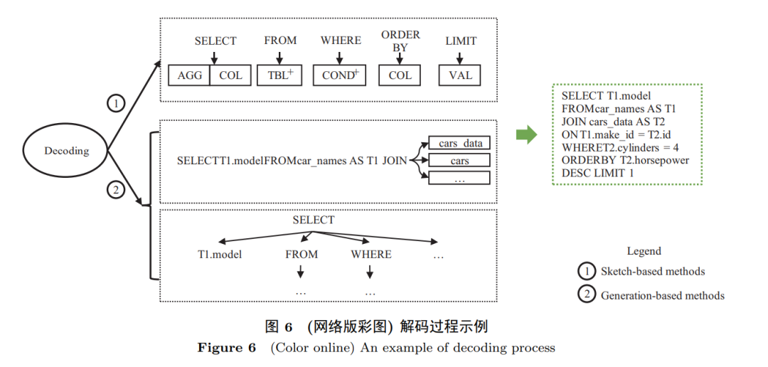 深度学习模型在对输入数据进行深层次编码处理与计算之后, 需要将模型的内部表示形式解码为 目标形式, 在 SQL 生成任务中的目标形式就是 SQL 语句及其等价的表示形式. 按照 SQL 生成方式 的不同可以将解码模型分为基于模版插值的方法和基于生成的方法, 在基于生成的方法中又可以根据 解码过程中是否有语法约束分为基于序列的 SQL 生成方法和基于语法的 SQL 生成方法. 图 6 展示了 SQL 语句生成方式. 第一种是基于模版插值的方法, 黑色框内的是需要插入的内容, 如果 AGG 表示聚合操作符号, COL 表示查询的列, TBL+ 表示查询的表, 可以由多个表连接而来, VAL 表示具体的数值类型. 第二种方式基于生成的方法, 可以具体分为是基于序列生成的方法和基于 语法生成的方法. 基于序列生成的方法将 SQL 语句看作是由普通单词构成的序列, 并根据已有的序 列预测下一个 SQL 中的单词, 挑选前 K 个概率最大的单词作为候选的下一个单词. 基于语法生成的 方法是在 SQL 语句生成过程中加入 SQL 抽象语法树结构的约束, 一般以从上至下的方式生成, 即从 树结构中的根节点往叶子结点 (终结符) 的方向生成. 表 4 [15, 50, 53, 56, 60, 69, 72∼74] 展示了在 SQL 生成任务中的经典模型以及目前最新模型的技术特点. 其中 WikiSQL 和 Spider 是目前 SQL 生成任务中最具代表性的数据集. 近期的研究中编码模型常用 预训练模型和图神经网络来增强模型对自然语言和数据库的编码能力, 并且解码模型中基于语法生成 的方法往往会取得更好的效果. 在解码过程中, 也有研究针对解码过程中的通用改进方法, 这些方法可以用于多种解码模型中. Vinyals 等[75] 提出指针网