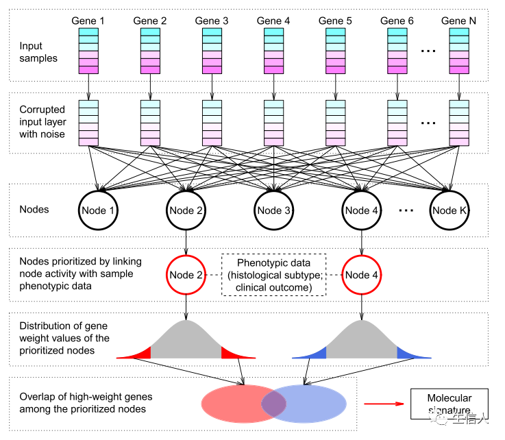 目前,已经有不少的研究者开始探索将深度学习模型应用于开发精准的生物标志物,帮助有效的疾病管理。发表在Genomics Proteomics Bioinformatics(Q1)的研究Denoising Autoencoder, A Deep Learning Algorithm, Aids the Identification of A Novel Molecular Signature of Lung Adenocarcinoma. 就给我们提供了很好的借鉴思路。作者采用无监督度学习算法,自编码器(Auto decoder)模型的拓展模型——去噪自编码器(Denoising Autoencoder)直接处理高维的基因表达特征,从而构建鲁棒的疾病生物标志物。自编码器(Auto decoder)是一种较为成熟的无监督深度学习算法,能够基于反向传播与最优化方法算法,利用输入数据本身作为监督,完成原始特征矩阵的非线性特征转换,提取的低维特征能够较好的反映原数据的特征。去噪自编码器是自编码器的拓展模型之一,会在输入数据中引入噪声,从而迫使编码器的隐藏层捕捉更鲁棒的特征。生物标志物的构建流程如下: