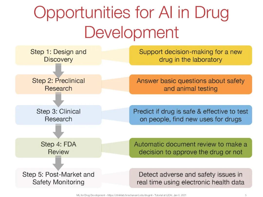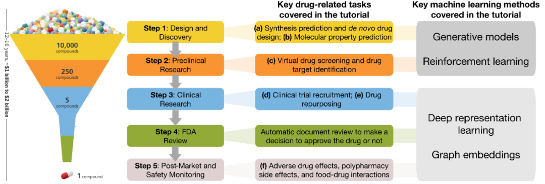 药物的发现和开发是一个漫长而昂贵的过程。它通常从分子和目标的实验发现开始(即药物从头设计),并在转入临床试验之前通过细胞系、类器官和动物的体外实验验证发现。一种新药从发现到监管机构批准的整个过程可能需要长达12年,成本高达28亿美元。此外,每个药物开发阶段都存在巨大的不确定性(1:50 000的成功率)。