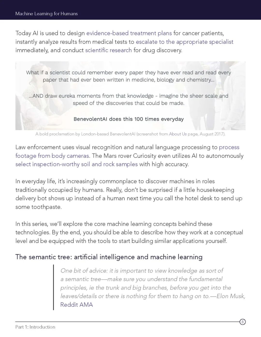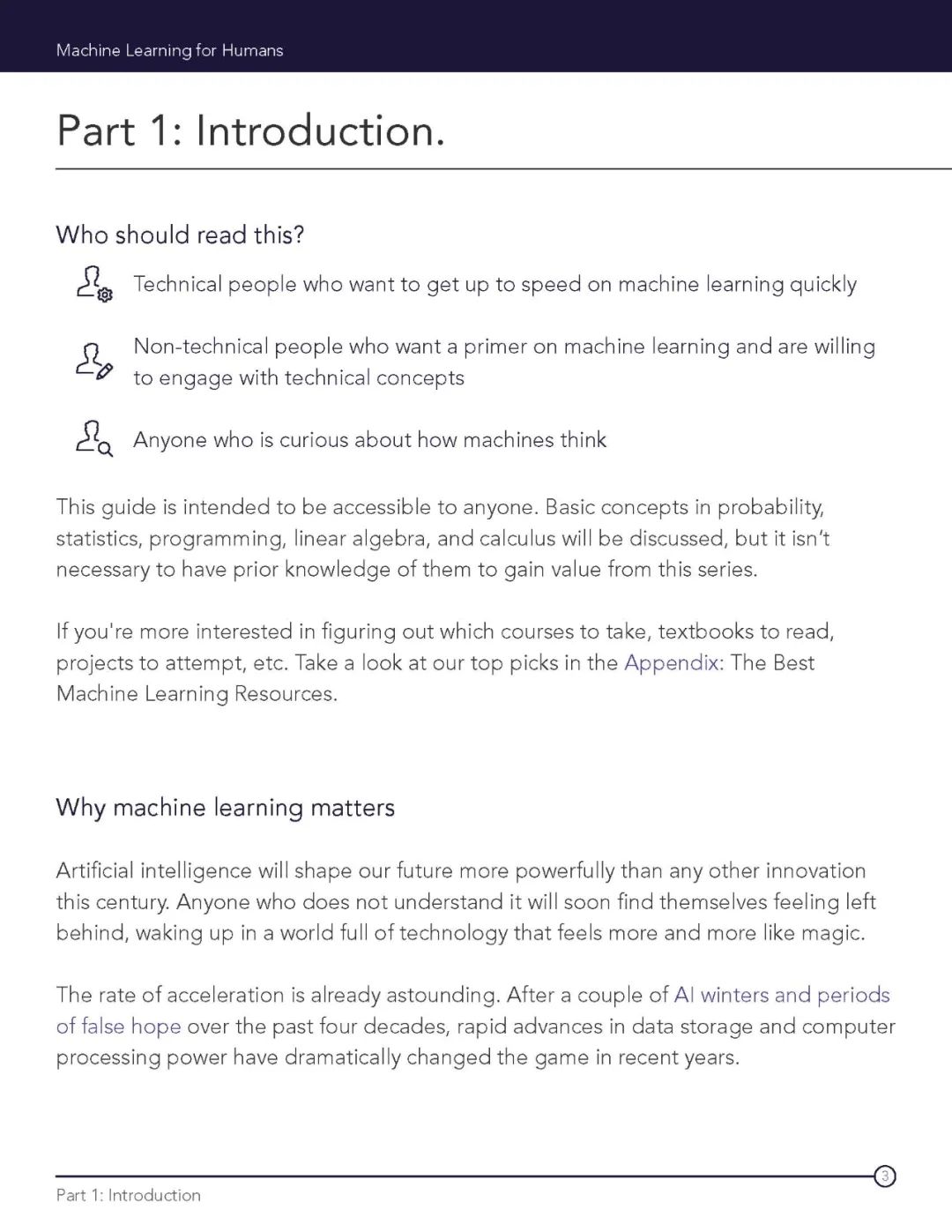 第一章 为什么机器学习至关重要。 本章描绘了人工智能和机器学习的发展全貌——从过去到现在,再到未来。