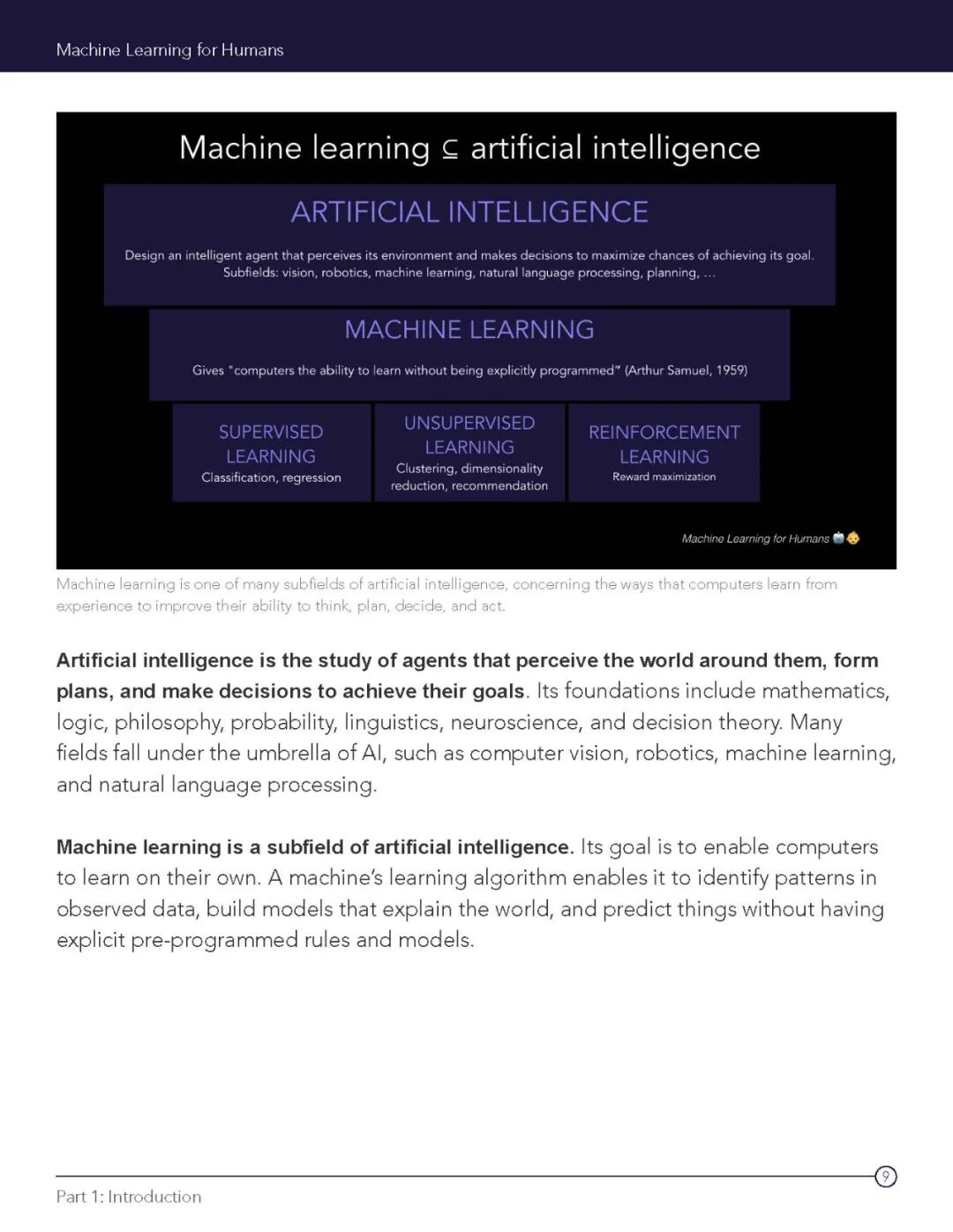 Machine Learning for Humans是国外机器学习爱好者之间流传甚广的一本电子书,它最先是Medium上的连载文章,后因文章质量出众、阅读价值高,作者在建议下把文章整理成电子书,供读者免费阅读。本书的作者Vishal Maini是耶鲁大学的文学学士,目前已入职DeepMind;另一名作者Samer Sabri同样毕业于耶鲁大学,目前正在加州大学圣迭戈分校的计算机学院攻读硕士学位。