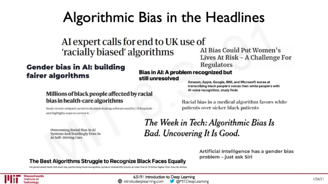 【导论】麻省理工学院最近开设一门深度学习课程MIT 6.S191,共包含十大主题课程,涵盖深度学习导论、序列建模、深度视觉、生成模型、强化学习、图神经网络、对抗学习、贝叶斯模型、神经渲染、机器学习嗅觉等,图文并茂,涵盖最新的前沿内容,非常值得学习!最新一讲是算法公平性与偏见。