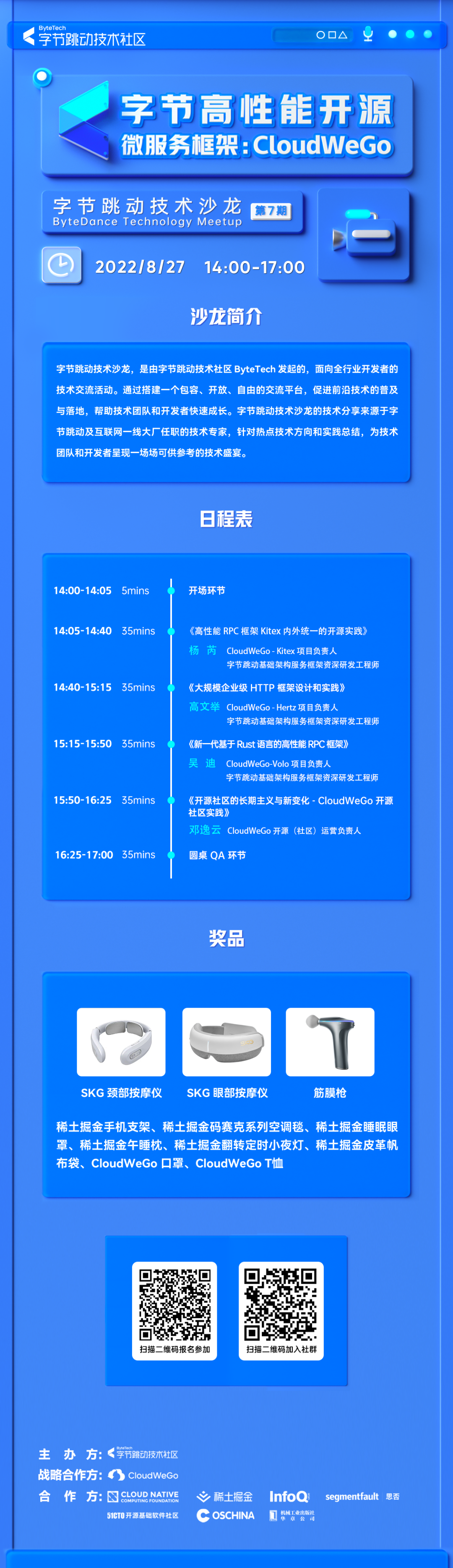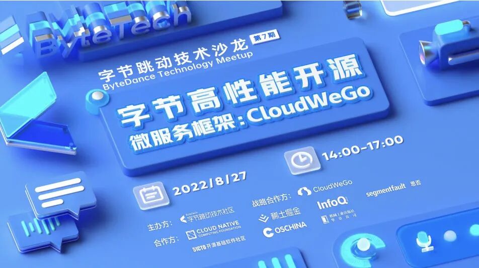 8 月 27 日下午 2 点,第七期字节跳动技术沙龙《字节高性能开源微服务框架:CloudWeGo》将以线上直播的方式,全面揭秘 6W+ 微服务高性能 RPC 框架 Kitex、大规模企业级 HTTP 框架 Hertz、基于 Rust 语言的另一种 RPC 框架以及 CloudWeGo 如何建设开源社区等关键问题。