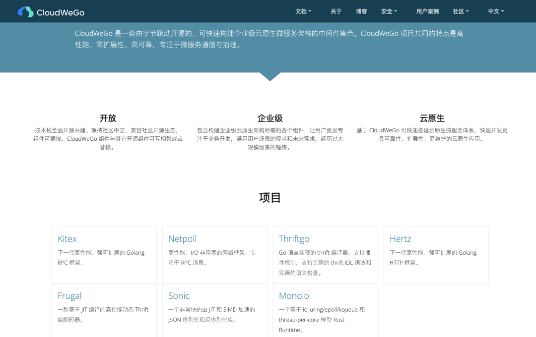 CloudWeGo 是一套可快速构建企业级云原生微服务架构的中间件集合,项目共同的特点是高性能、高扩展性、高可靠,专注于微服务通信与治理,主体选用了 Go 语言。