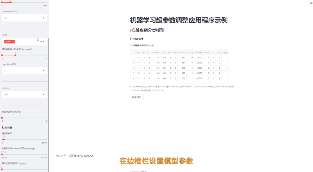 st.sidebar.subheader('其他参数' ) parameter_random_state = st.sidebar.slider( '随机数种子' , 0 , 1000 , 42 , 1 ) parameter_bootstrap = st.sidebar.select_slider( '构建树时的Bootstrap示例 (bootstrap)' , options=[True , False ]) parameter_n_jobs = st.sidebar.select_slider( '并行运行的线程数 (n_jobs)' , options=[1 , -1 ])