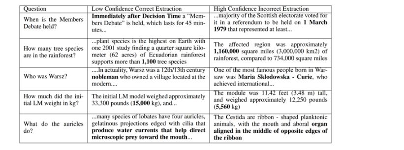 但是,由于Document-QA没有给出单个答案,因此算法可能会将最可能的答案指定为较低的优先级,这可能根本没有任何意义。我们假设,如果模型只能看到包含答案的段落,那么它可能会对启发式或模式过于自信,这种模型只有在先验知道存在答案时才有效。例如,在下面的表2中(根据论文进行调整),我们观察到,即使问题单词与上下文不匹配,模型也会为与答案类别强烈匹配的跨度分配高信度值。如果有答案,这可能会工作得很好,但在其他情况下可能不会有这么好的效果。