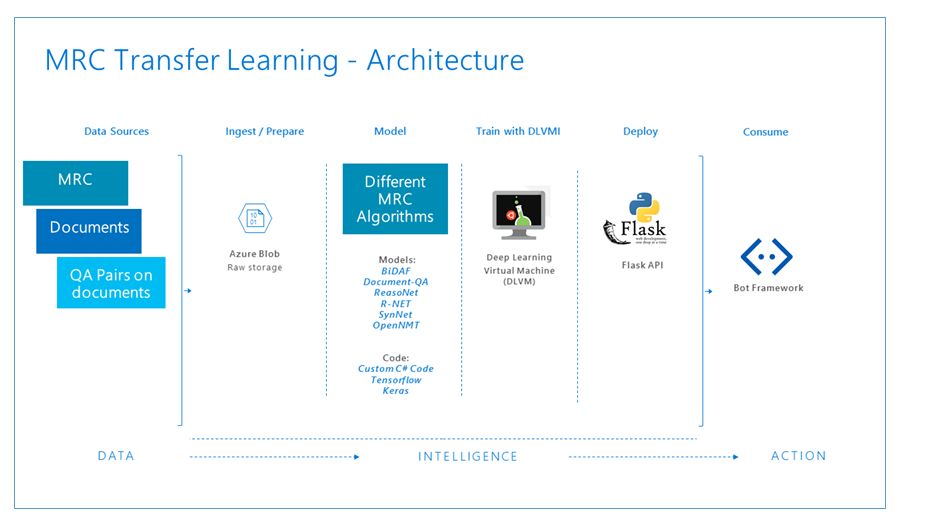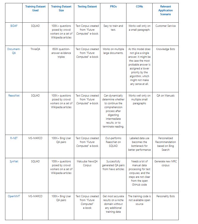 为了比较研究,我们想要在不同的数据集上训练不同的MRC模型,并在单个大型语料库上测试它们。为了达到本博文的目的,我们使用六种MRC模型方法 - BIDAF,DOCQA,ReasoNet,R-NET,SynNet和OpenNMT - 使用训练好的MRC模型为大语料库创建QA-Bot,然后比较结果。