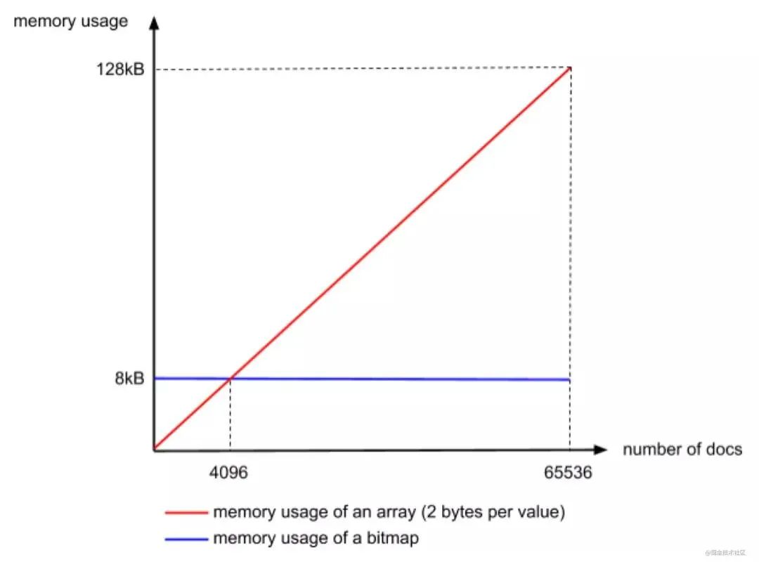 将 doc id 拆成高 16 位,低 16 位。对高位进行聚合 (以高位做 key,value 为有相同高位的所有低位数组),根据低位的数据量 (不同高位聚合出的低位数组长度不相同),使用不同的 container(数据结构) 存储。分界线的来源:value 的最大总数是为2^16=65536. 假设以 bitmap 方式存储需要 65536bit=8kb,而直接存值的方式,一个值 2 byte,4K 个总共需要2byte*4K=8kb。