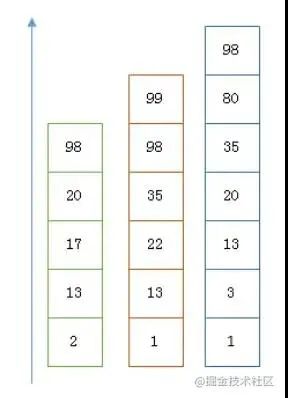 遍历的过程可以跳过一些元素,比如我们遍历到绿色的 13 的时候,就可以跳过蓝色的 3 了,因为 3 比 13 要小。