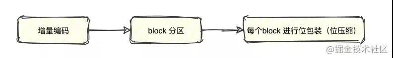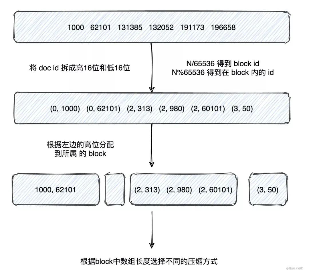 会把所有的文档分成很多个 block,每个 block 正好包含 256 个文档,然后单独对每个文档进行增量编码,计算出存储这个 block 里面所有文档最多需要多少位来保存每个 id,并且把这个位数作为头信息(header)放在每个 block 的前面。